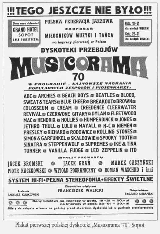Pierwsza profesjonalna dyskoteka w Polsce, Musicorama, ruszyła 18 lipca 1970 roku w sopockim Grand Hotelu. Zorganizował ją Franciszek Walicki, a didżejami byli m.in. Piotr Kaczkowski i inni znani prezenterzy radiowi. Choć grano na niej rock i soul, to właśnie dzięki niej Polacy po raz pierwszy zobaczyli stroboskop i mogli posłuchać najnowszej zachodniej muzyki. Ta pionierska impreza zapoczątkowała szaleństwo dyskotek, które szybko opanowało cały kraj.