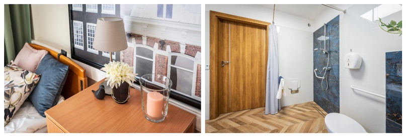 Budynek i otoczenie są pozbawione barier architektonicznych. Przytulne i jasne pokoje z dużymi oknami wyposażone we wszystko co niezbędne do wygodnego mieszkania osoby z niepełnosprawnościami. Znajdziemy tam łóżka rehabilitacyjne, stoliczki nocne, inne niezbędne meble, a łazienki wyposażone w sprzęt ułatwiający korzystanie z nich, przy czym wszystkie wnętrza zaprojektowane w nowoczesnym stylu.