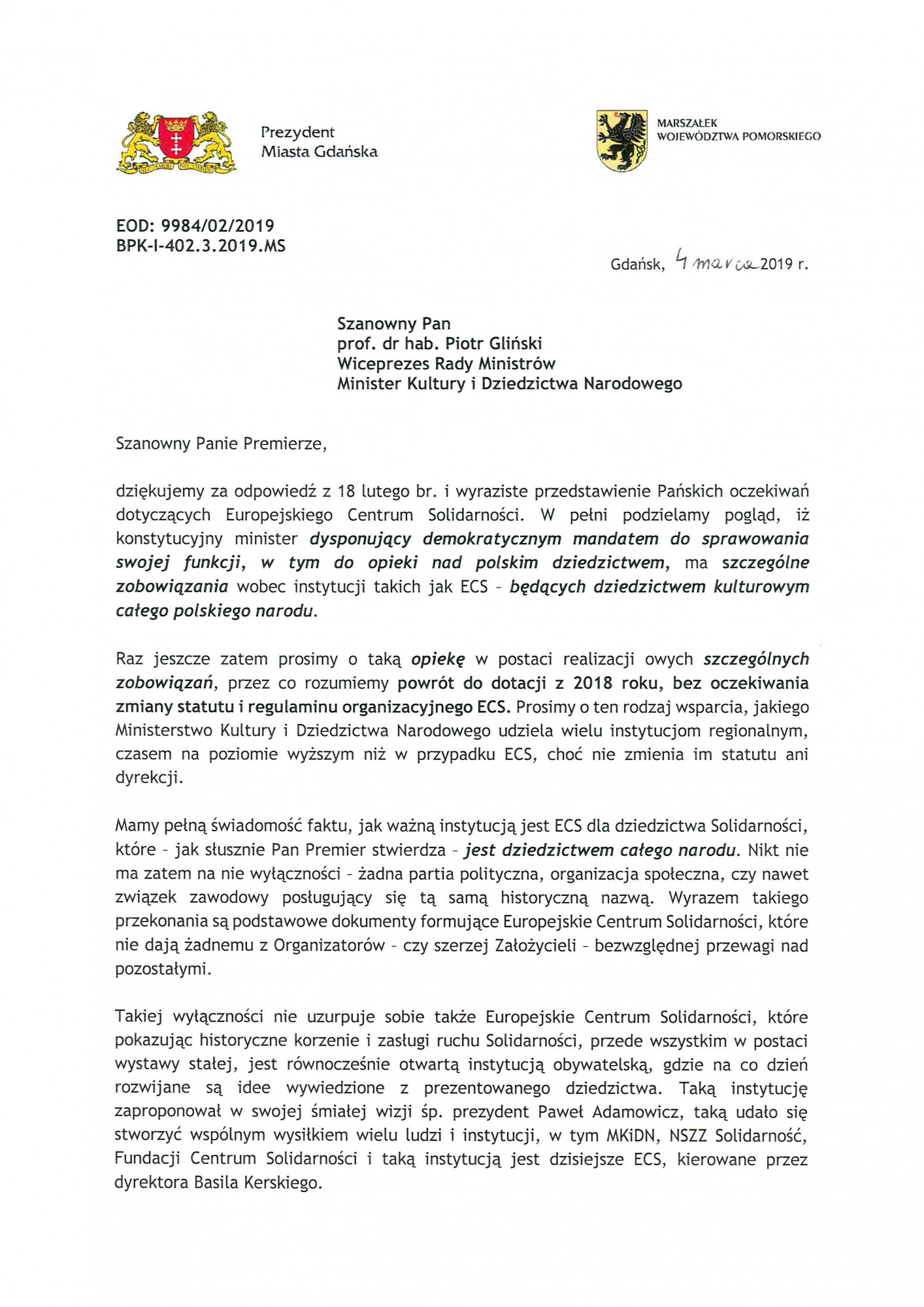 List zawierający wspólne stanowisko władz Gdańska i Samorządu Województwa Pomorskiego dotyczące Europejskiego Centrum Solidarności. Jest to odpowiedź na pismo Ministra Kultury i Dziedzictwa Narodowego z 18 lutego br.