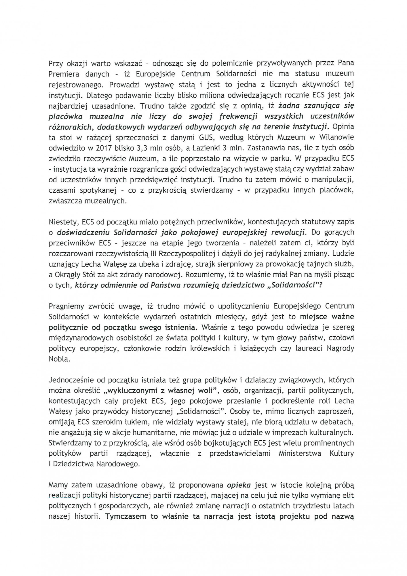 W liście Prezydent Gdańska Aleksandra Dulkiewicz i marszałek Mieczysław Struk zwracają się do prof. Piotra Glińskiego - nadmieniają, że ECS jest dziedzictwem kulturowym całego polskiego narodu. W związku z powyższym zwracają się z prośbą o opiekę w postaci realizacji szczególnych zobowiązań  tj. powrotu dotacji z 2018 roku, bez oczekiwania zmiany statutu i regulaminu organizacyjnego ECS. W piśmie odwołują się również do historii, polityki kraju, a także odpierają wcześniej postawione zarzuty wobec ECS. Nawołują również do współpracy i zachęcają do zjednoczenia podczas Święta Wolności i Solidarności.