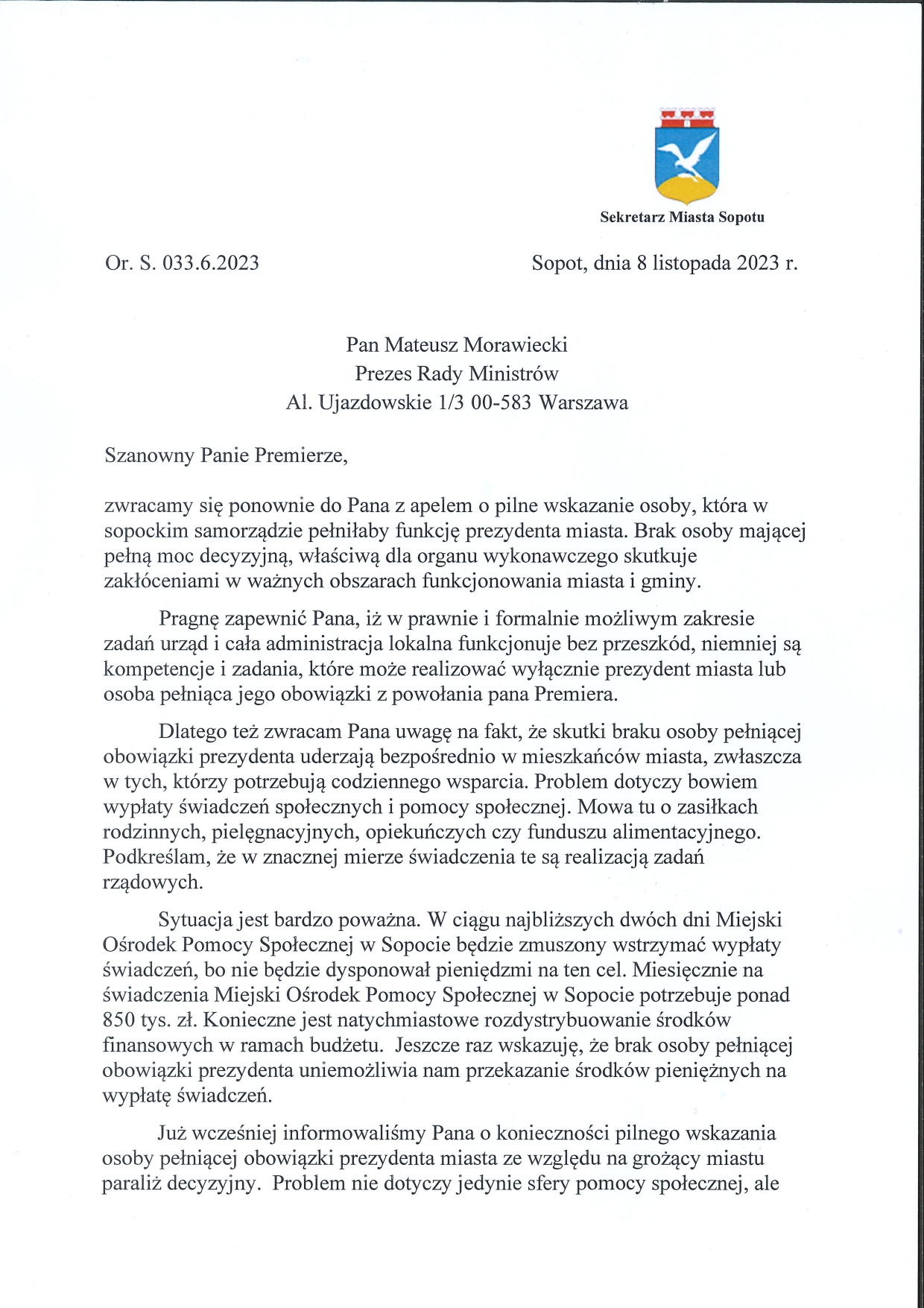 Niemal miesiąc po wyborach w Sopocie nadal nie ma osoby pełniącej obowiązki prezydenta. Brak decyzji premiera w tej sprawie może skutkować wstrzymaniem wypłat świadczeń społecznych. Środki na ten cel muszą być przesunięte w ramach budżetu, a takich kompetencji nie ma zarządzający miastem Sekretarz. Pieniądze na wypłaty świadczeń, którymi dysponuje MOPS wystarczą na dwa dni. Wojciech Zemła zwrócił się ponownie do premiera Morawieckiego o pilne wyznaczenie osoby pełniącej funkcję prezydenta Sopotu.