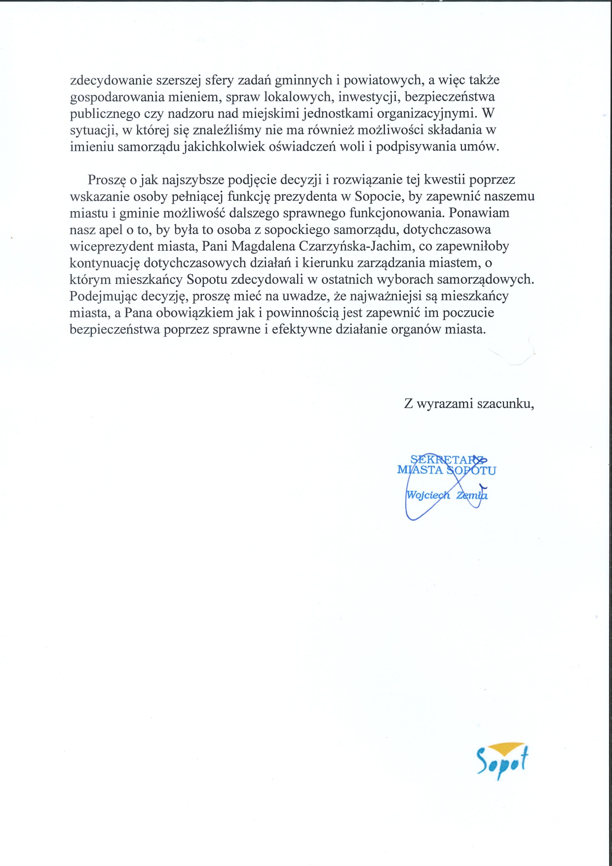 W związku z tą sytuacją, Wojciech Zemła, Sekretarz Miasta zwrócił się z kolejnym apelem do premiera Mateusza Morawieckiego o pilne wskazanie osoby pełniącej obowiązki prezydenta Sopotu. W piśmie podkreślił, że brak osoby mającej pełną moc decyzyjną skutkuje poważnymi zakłóceniami w ważnych obszarach funkcjonowania gminy, a paraliż decyzyjny uniemożliwia dalsze sprawne funkcjonowanie samorządu.