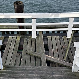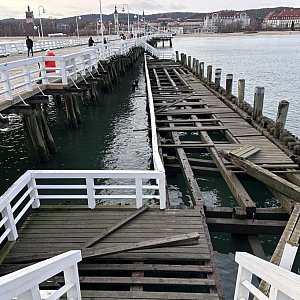 Sztormowe warunki, z typową dla tego okresu cofką, naruszyły dolny pomost w okolicach ostrogi. Nagrania udostępniane w sieci pokazują wybijane deski i powstające uszkodzenia. Na szczęście reszta konstrukcji, w tym główny pomost spacerowy i budynek na głowicy, wydają się być nietknięte. Na pełne oszacowanie zniszczeń trzeba będzie jednak jeszcze poczekać.