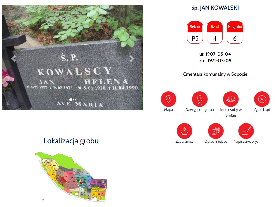 Cmentarz Komunalny w Sopocie należy do grona nekropolii, które korzystają z systemu Grobonet. To intuicyjna baza danych, umożliwiająca łatwe odnalezienie grobów osób pochowanych w mieście. Wystarczy wpisać imię i nazwisko zmarłego, by system wskazał dokładne położenie grobu – sektor, rząd i numer miejsca. Wyniki prezentowane są z fotografią nagrobka, informacjami o dacie urodzin i śmierci oraz mapą z dokładną lokalizacją.
