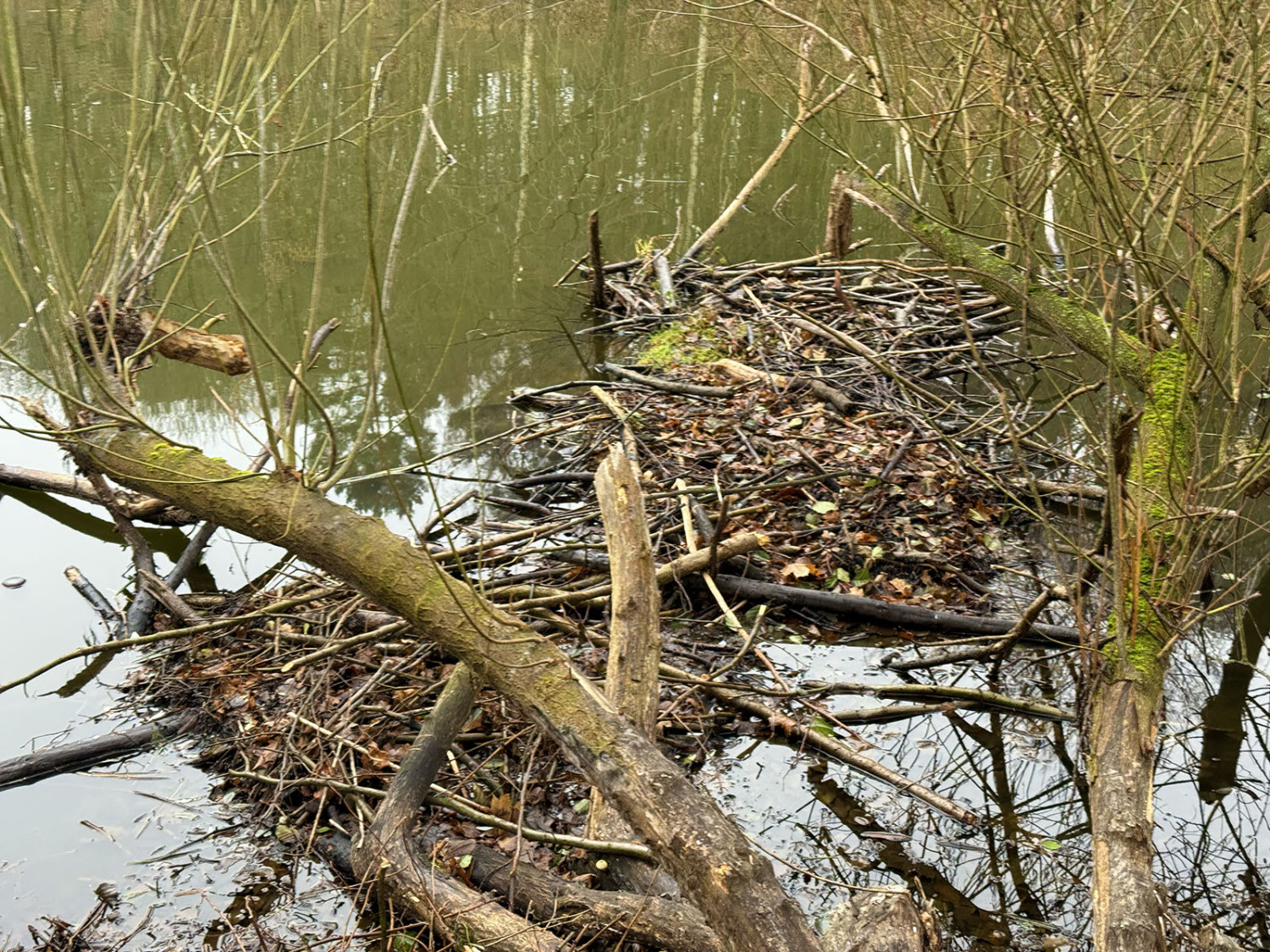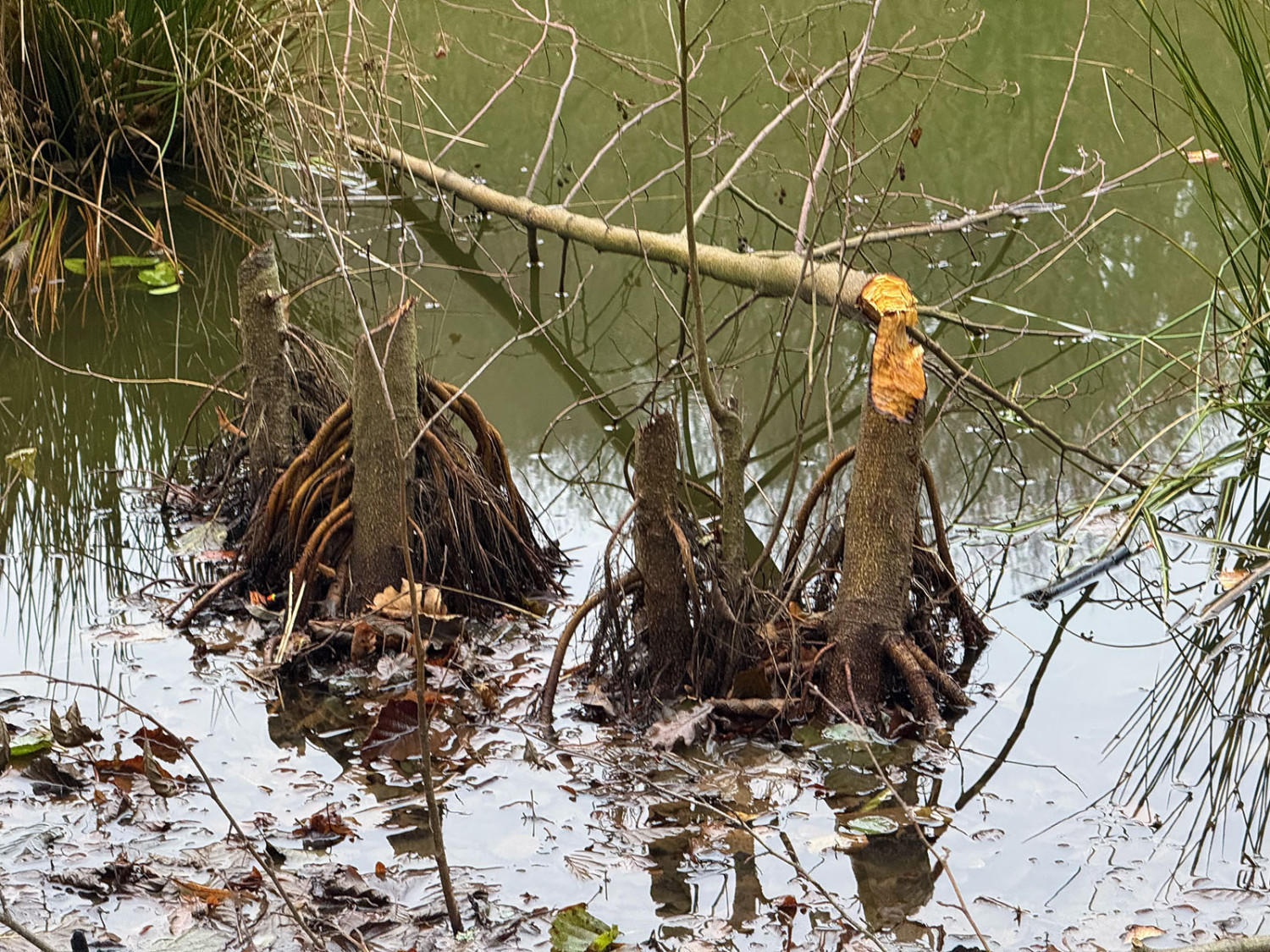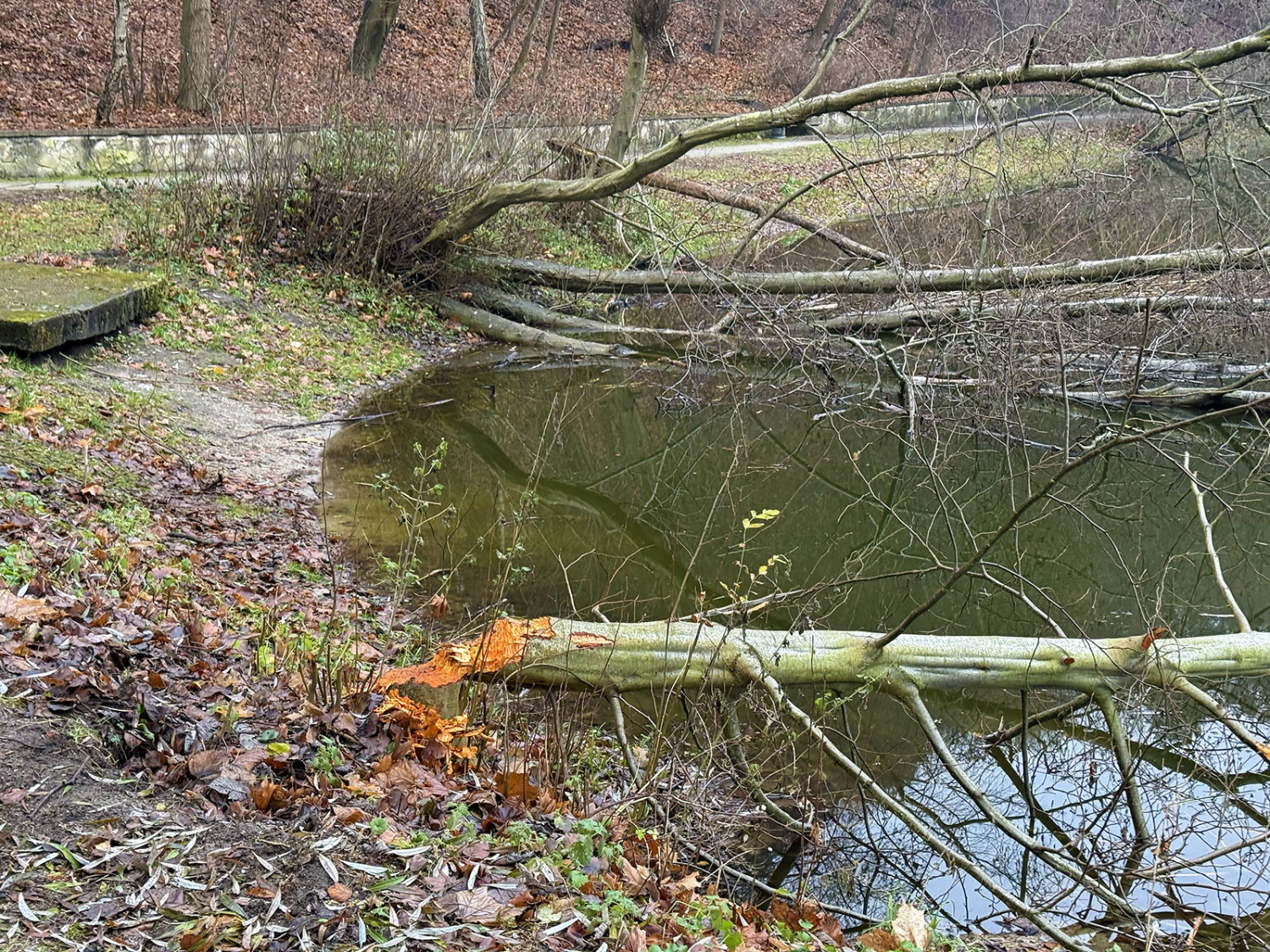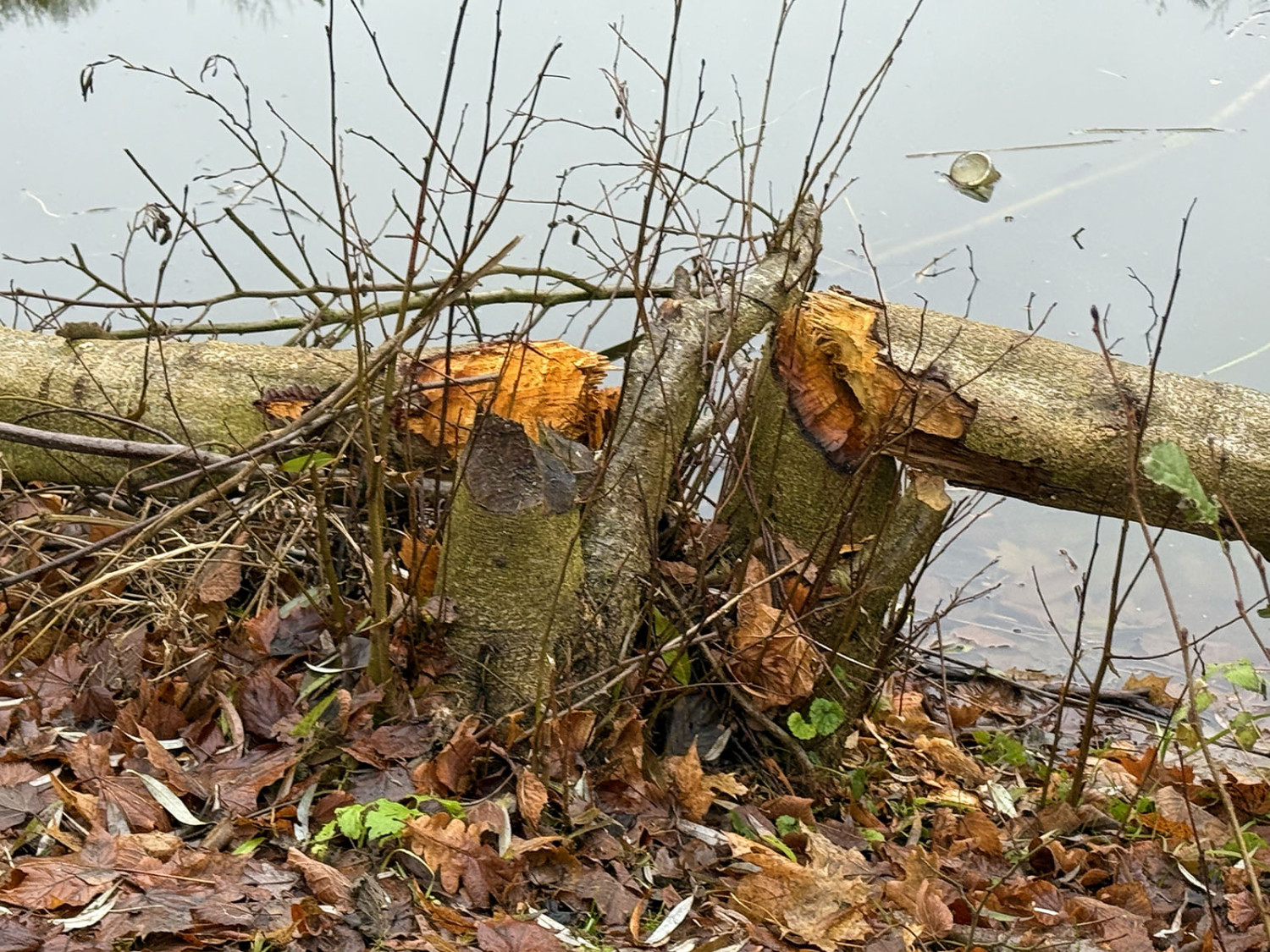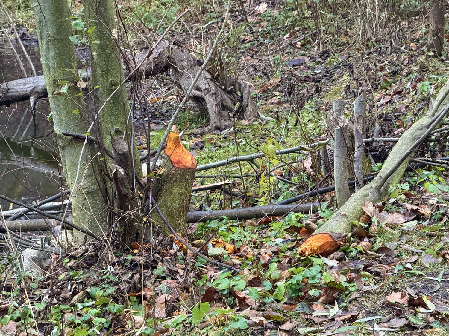 Świeże zręby, zwalone drzewa oraz pierwsze konstrukcje przypominające tamy świadczą o tym, że pracowite gryzonie zadomowiły się nad zbiornikiem wodnym. Na jego brzegach widać charakterystycznie stożkowo „ostrugane” pnie, które bobry ścinają, by zdobyć budulec do tam i żeremi, a także pokarm w postaci kory i młodych pędów. Niektóre drzewa zostały już powalone. Część z nich wpadła do wody, stanowiąc materiał pod przyszłe konstrukcje. To pierwsze tak wyraźne ślady ich obecności właśnie w tym miejscu. Do tej pory bobry obserwowano głównie w okolicach Stawu Mazowieckiego, a także wzdłuż biegu Sweliny.