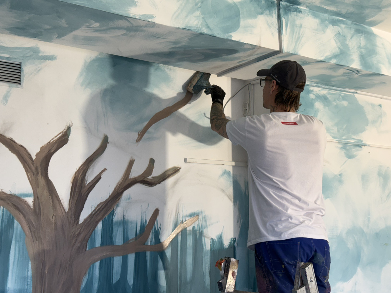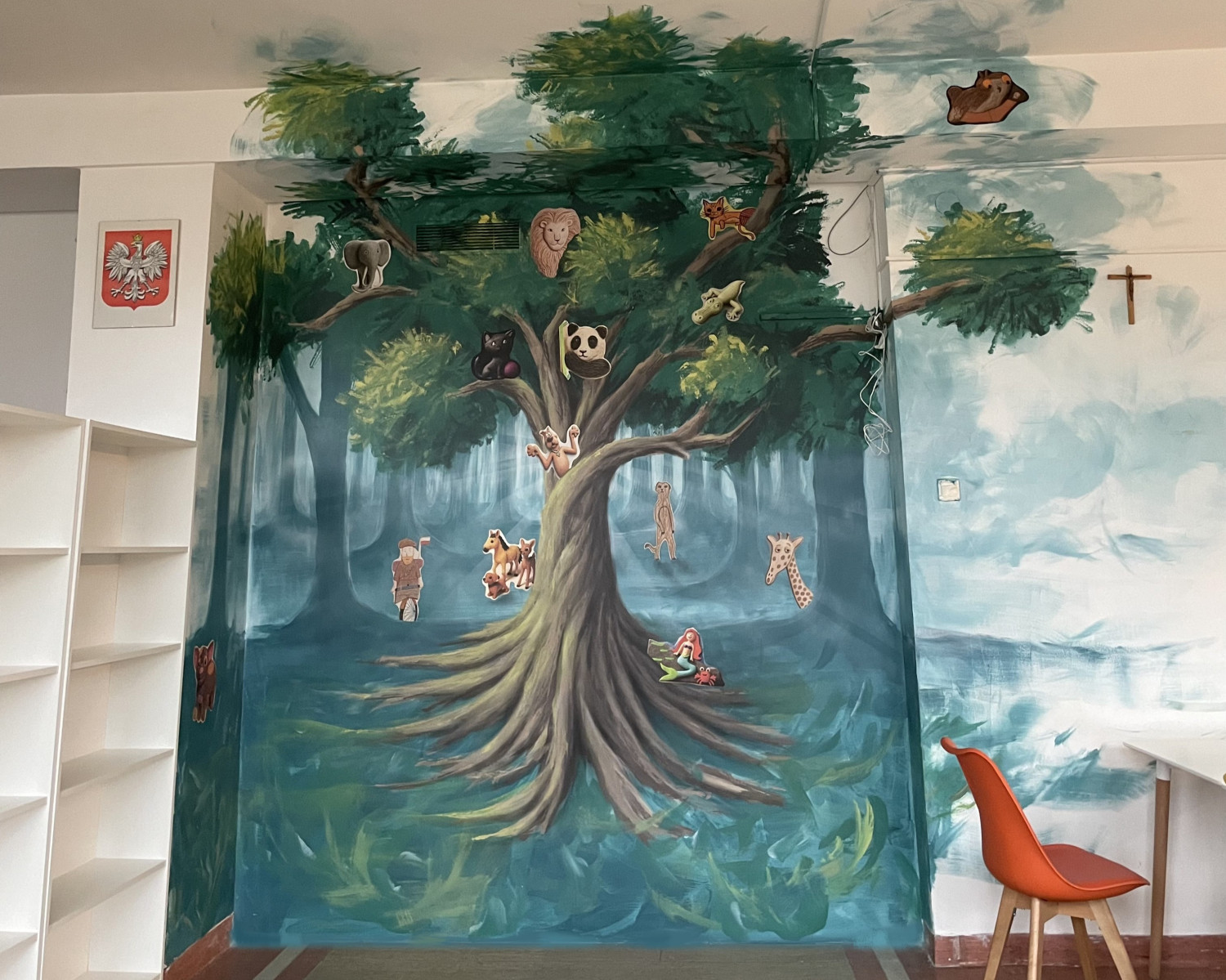 Mural powstał w miejscu, które wkrótce stanie się kącikiem ciszy – przestrzenią relaksu dla młodszych uczniów. Będzie to miejsce, w którym dzieci mogą: odpocząć, poczytać, wyciszyć emocje, pobyć w otoczeniu sztuki.