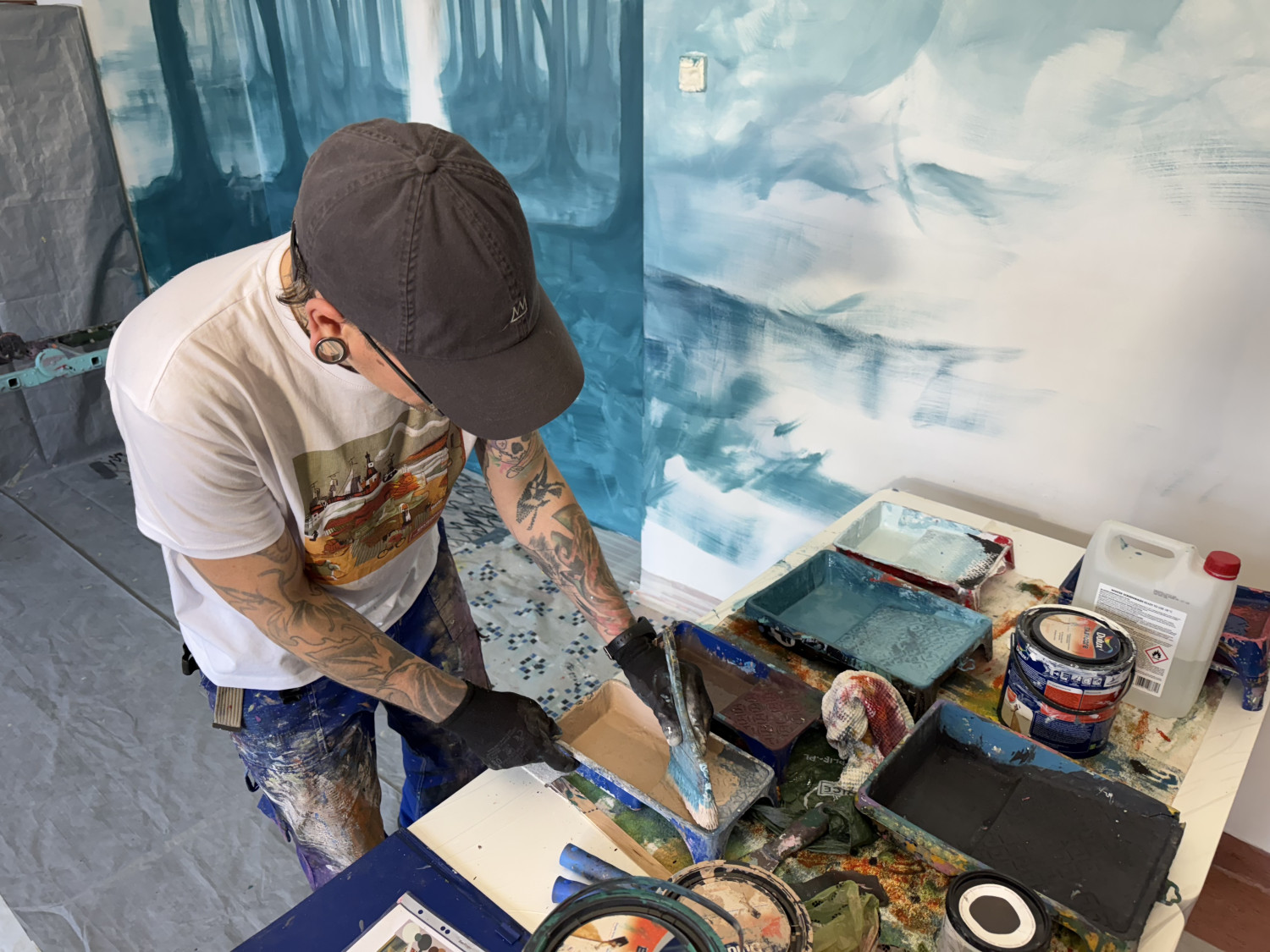 Artysta pracował ekspresyjnymi pociągnięciami, wykorzystując szpachle, szerokie pędzle i zestaw autorskich narzędzi, co widać także w dostępnych fotografiach z procesu twórczego.
