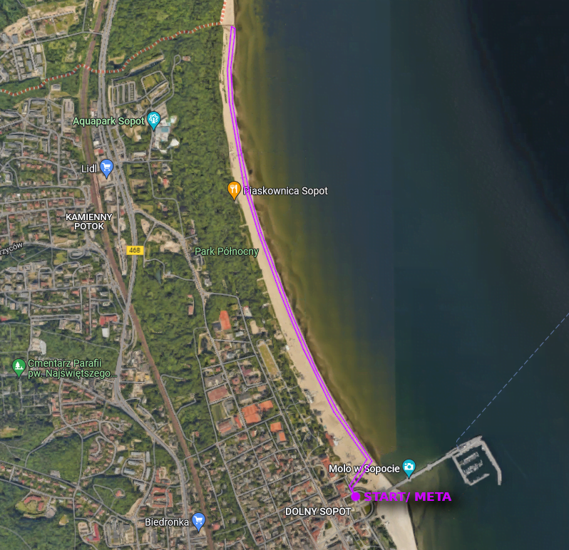 Uczestnicy zmierzą się z trasą o długości ok. 4,5 km, poprowadzoną w większości sopocką plażą – od Skweru Kuracyjnego w kierunku granicy miasta z Gdynią i z powrotem. Start zaplanowano punktualnie o godz. 10:00, a meta również znajdzie się na Skwerze Kuracyjnym.