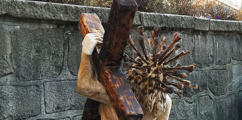 Tuż przy kościele św. Jerzego w Sopocie pojawiła się nowa rzeźba. Przedstawia Jezusa dźwigającego krzyż, jednak nie jest to zwyczajny monument. Na głowie Chrystusa w miejsce korony cierniowej znalazł się koronawirus.
