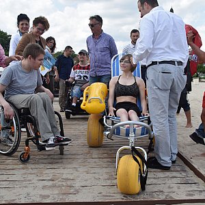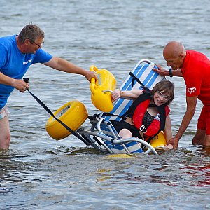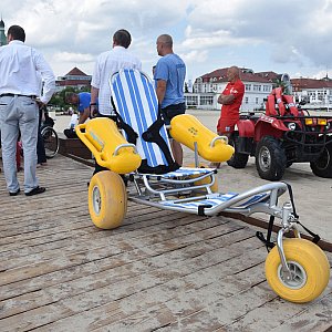 Osoby z niepełnosprawnością ruchową mogą skorzystać z Amfibii, specjalnego sprzętu umożliwiającego wjazd do wody. 18 czerwca odbyło się oficjalne przekazanie wózka wyposażonego w szerokie koła i pływaki do użytku plażowiczom o ograniczonej sprawności ruchowej. Osoba korzystająca z Amfibii może z łatwością unosić się na wodzie i korzystać z kąpieli w morzu. Pomocy w wodowaniu udzielają osoby z Sopockiego Wodnego Pogotowia Ratunkowego, na terenie miejskiego kąpieliska strzeżonego przy wejściu nr 23. To wejście na plażę miejską jest również w podest dla wózków – osób z niepełnosprawnością oraz niemowląt i dzieci.