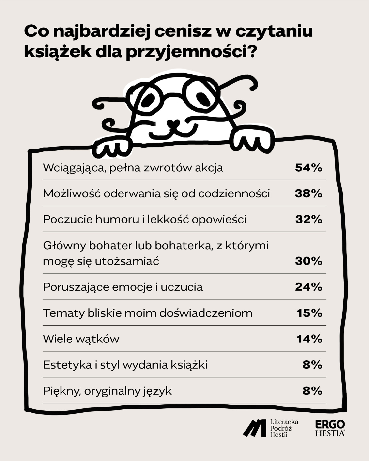 Z badań wyłania się obraz pokolenia, które nadal chce czytać, ale „po swojemu”. Młodzi cenią książki, które pozwalają się oderwać od codzienności, są pełne humoru, mają bohaterów z krwi i kości oraz historie, w których mogą się przejrzeć. To właśnie te emocje, lekkość i możliwość utożsamienia się z postacią sprawiają, że książka staje się ich osobistym wyborem, a nie obowiązkiem. Badania przeprowadzone na zlecenie ERGO Hestii pokazują też, że mimo dynamicznych zmian technologicznych i konkurencji ze strony ekranów, książka pozostaje zauważalnym elementem kultury młodych, choć sama praktyka czytania staje się coraz bardziej zróżnicowana.
