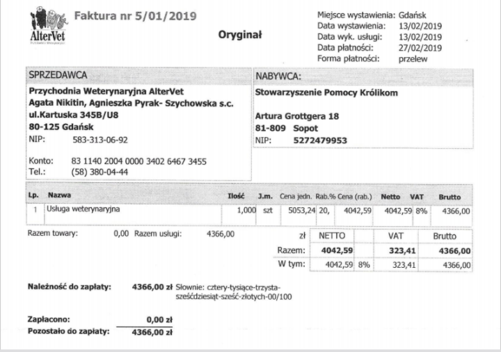 Poświęcamy czas, wkładamy serce i staramy się, aby nasi podopieczni mieli jak najlepsze warunki. Jednak jest coś, czego nie jesteśmy w stanie sami zapewnić. Są to pieniądze... Prosimy Was o pomoc w opłaceniu faktury... :( Kwota jest wysoka, ponieważ w styczniu aż 12 naszych podopiecznych korzystało z pomocy lekarza weterynarii. Leczenie i hospitalizacja Pandory, Puszka i Charliego pochłonęły najwięcej środków. Na wizyty weterynaryjne regularnie jeździ Mrówka i Chester. W styczniu weterynarza odwiedziła także Amika, Duduś, Felix, Śnieżynka, Matylda, Rokita i Inka. Do tego dochodzą kastracje, badania krwi i bobków, zakup leków, USG, RTG, laseroterapia. Wszystko dla zdrowia i ratowania życia naszych Uszaków. Jeśli macie możliwość wesprzeć nasze działania prosimy o pomoc w opłaceniu faktury. ?25 2130 0004 2001 0516 7234 0003 Stowarzyszenie Pomocy Królikom ul. Artura Grottgera 18 81-809 Sopot TYTUŁ: Darowizna na leczenie ?SMS o treści: ICH.SPKSOPOT ? 7155 - 1.00 zł (1.23 z VAT) ? 7355 - 3.00 zł (3.69 z VAT) ? 7555 - 5.00 zł (6.15 z VAT) ? 91055 - 10.00 zł (12.30 z VAT) *wpłat można dokonywać tylko z polskich numerów *operator pobiera prowizję ?https://www.paypal.me/SopockieUszakowo ?bezpośrednio przycisk PRZEKAŻ DATEK na naszej stronie FB pod tłem Dziękujemy w imieniu podopiecznych Sopockiego Uszakowa! <3
